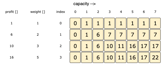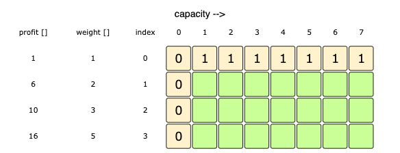 I'm having a hard time understanding why the row (index 0) gets filled with all 1's. There are 4 items (various weights & profits). Does the index mean item count? If so, you should be able to have more profit with more capacity in the 1st row. It shouldn't be filled with all 1's. So I am not understanding the diagram ( https://lwfiles.mycourse.app/systemdesign-public/10cd89386658f0f18522e58386389d80.png ).
